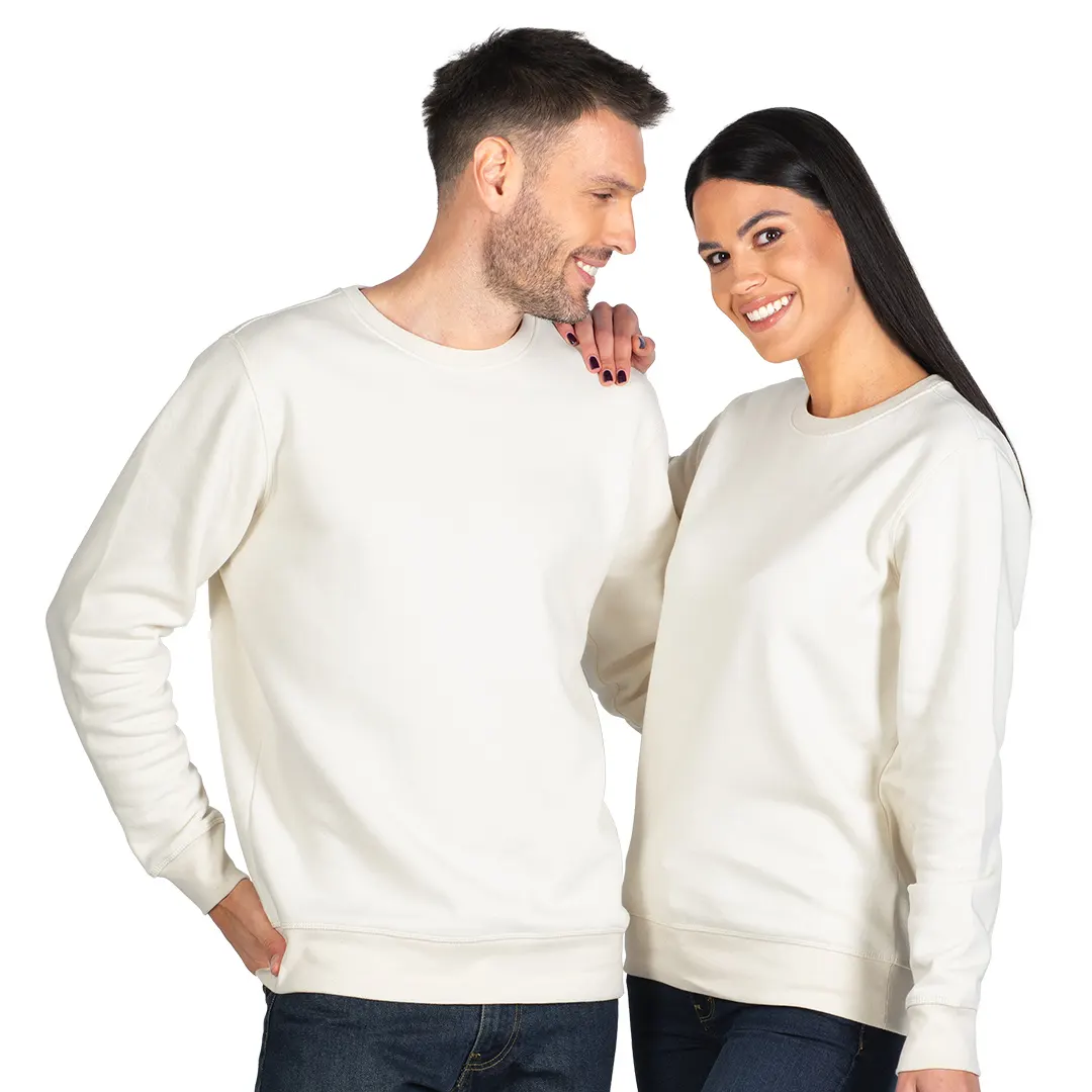 Dukserica od organskog pamuka, elastične ranfle oko vrata, na rukavima i dnu, okovratnik ojačan trakom, dodatni štepovi na okovratniku, rukavima, ramenima i dnu.
