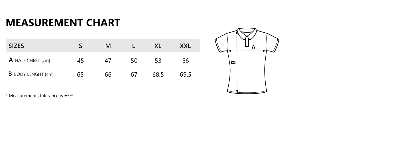 Šivena sa strane, dupli štepovi na dnu i oko pazuha, ranfle oko rukava, dva dugmeta u boji majice, rezervno dugme, ojačana trakom duž vrata i dodatnim štepom duž ramena.