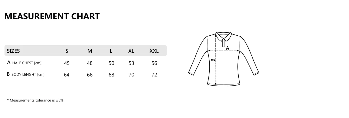 Ženska polo majica dugih rukava, 200 g/m2, blago strukirana, šivena sa strane, dupli štepovi na rukavima i dnu, četiri dugmeta u boji majice, rezervno dugme, dodatni štep duž ramena, okovratnik ojačan trakom, šlicevi sa strane.