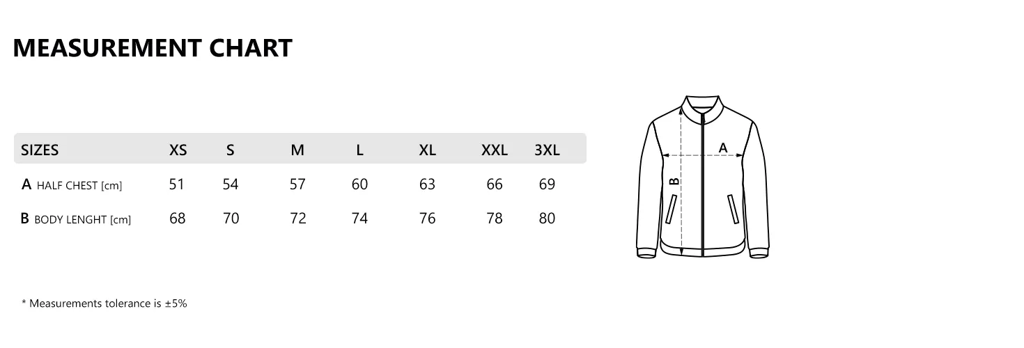 Radna jakna, visoka kragna, kapuljača u kragni, elastične ranfle oko rukava sa čičak trakom za podešavanje širine rukava, duži zadnji deo, tri džepa na grudima, dva prednja džepa, jedan unutrašnji džep, skriveni unutrašnji rajsferšlus na leđima za lakši pristup prilikom štampanja.